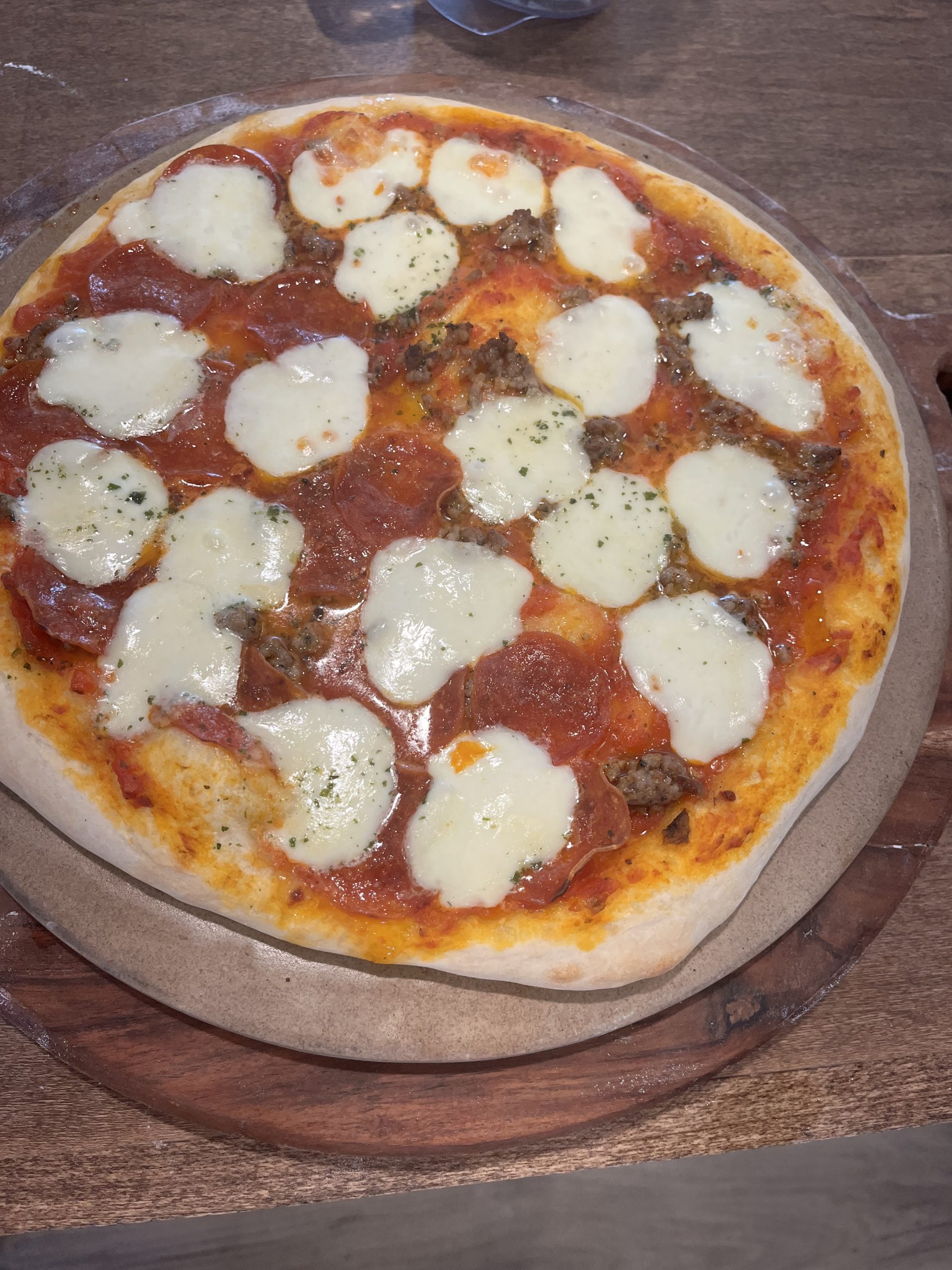 We usually top our pizzas with pizza sauce made from garden produce, Italian sausage from our pigs, and fresh mozzarella made with raw milk. Before I started making our own pizza sauce, I used Rao’s Homemade Margherita Pizza Sauce from the store. Use whatever toppings you prefer. Sprinkle with dried basil and oregano (or herbs of your choice), and drizzle the crust lightly with olive oil if desired.